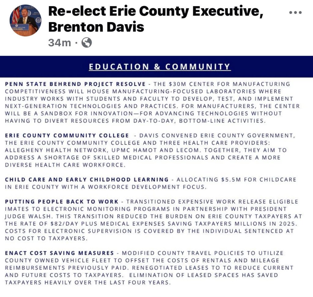 - Davis vetoed the grant for childcare. It’s only because Erie County Council overrode the veto (with Bayle and Schauerman voting against the override) that there is funding.